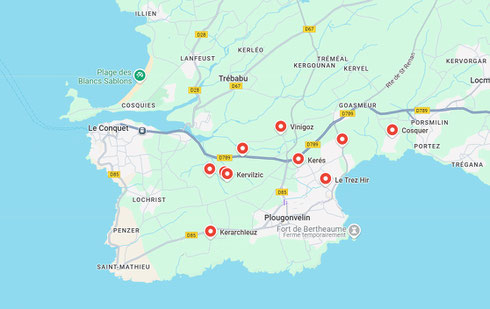 Les branches ascendantes occupent de nombreux lieudits de Plougonvelin selon les époques, hameaux parfois non précisés dans les actes de baptême/naissance ou de sépulture/décès.