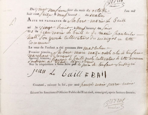 Acte de naissance de Robert LE BAILL, 1816 (Archives Départementales du Finistère).